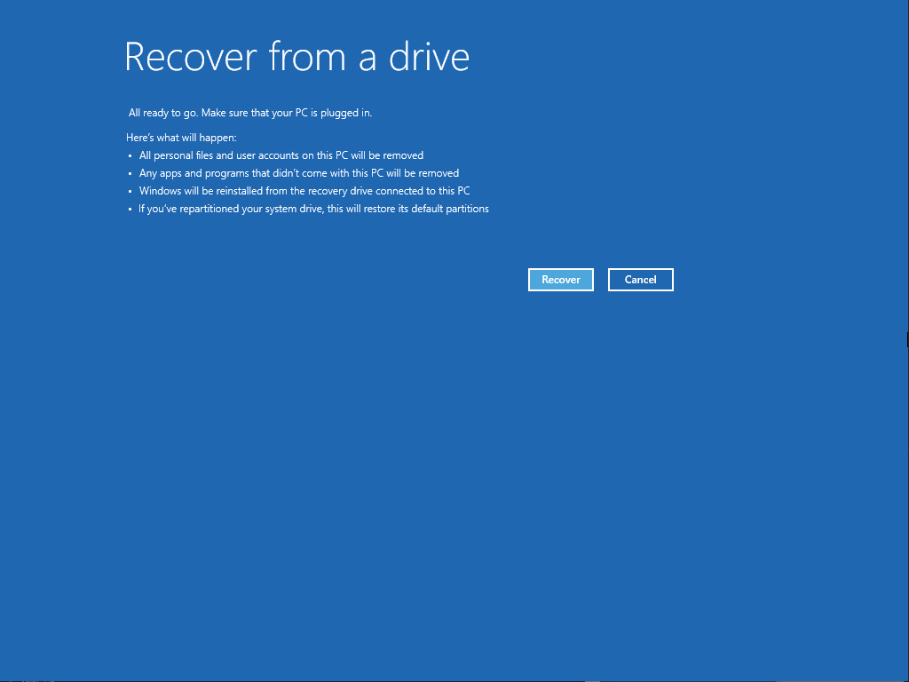 | If the "Recover from a drive" option does not appear, the USB flash drive may be faulty. Try another USB flash drive and make sure that the files are properly unzipped.  |