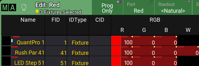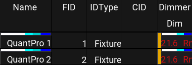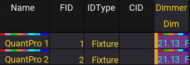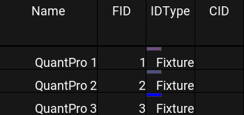 Markers above the IDType in the fixture sheet indicate a group master is currently influencing the output of the marked fixture.