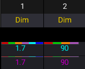 Markers above the name and dimmer value of fixture 1 indicate active information in the programmer. Markers only above the dimmer value of fixture 2, but not above the name, indicate information output from a sequence.