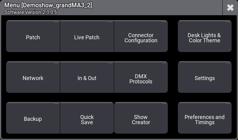 The backup menu is used to save and load shows - read more in the Show File Handling topic. -