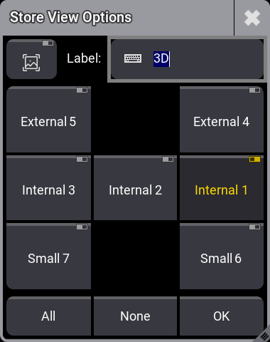 This is used to directly label the view and select which screens should be stored in the view. Each screen has a button that can be turned On or Off. The last touched screen is selected as a default. There are two buttons at the bottom that give fast access to select All or None of the screens. Tap OK to store the window arrangement of the selected screens or press Please to confirm the options.