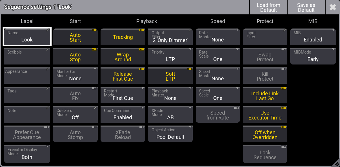 The title bar has two relevant buttons. The left one is Load from Default. Tapping this loads the stored sequence defaults. Next to this is Save as Default. Tapping this stores the current settings as the new default.