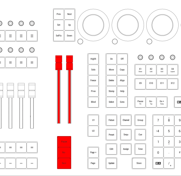 The master keys 1+2 and the master knobs 1+2 are located in the upper part of the master area.