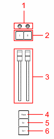 The Go+ [Large] key, the Go- [Large] key, and the Pause [Large] key are located in the lower part of the master area. These keys execute the Go+, Go- or Pause command for the selected sequence.