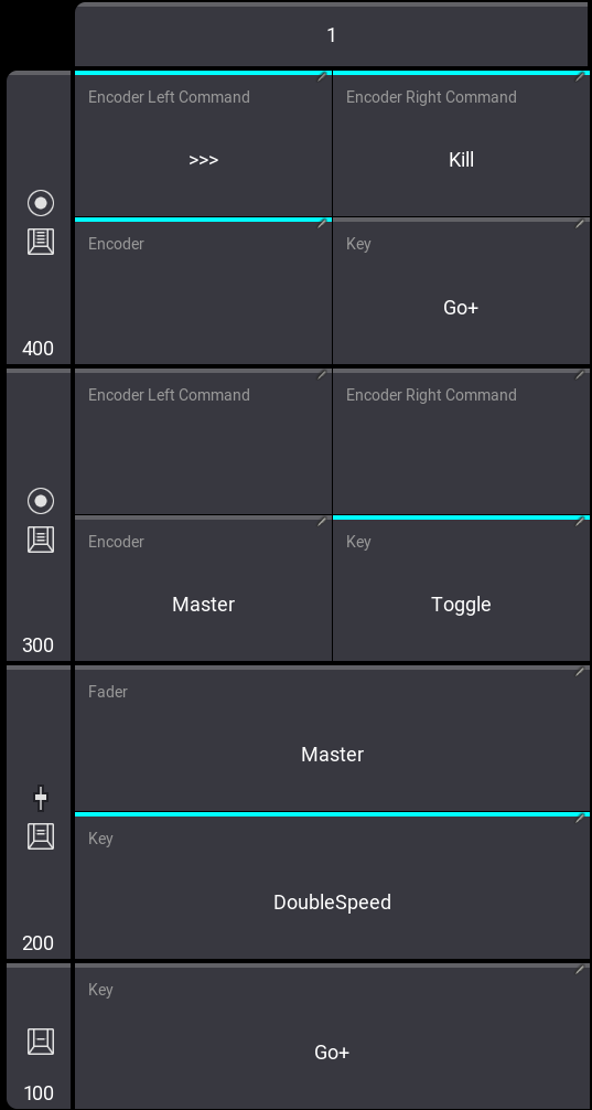 The 100-row only offers a single executor button. The 200-row has a button and a fader. Both the 300- and 400-rows have a button and an encoder knob. If an executor is extended to cover all four rows, then it could look like this: