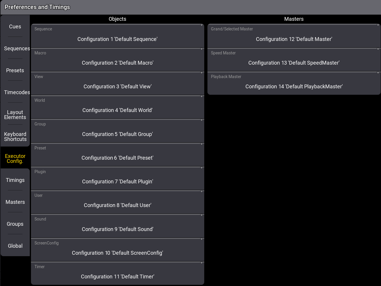 This menu has a setting for each object type that can be assigned to an executor. Tapping each of these settings opens a small select pop-up where any of the executor configurations can be selected as the default settings for the object type.