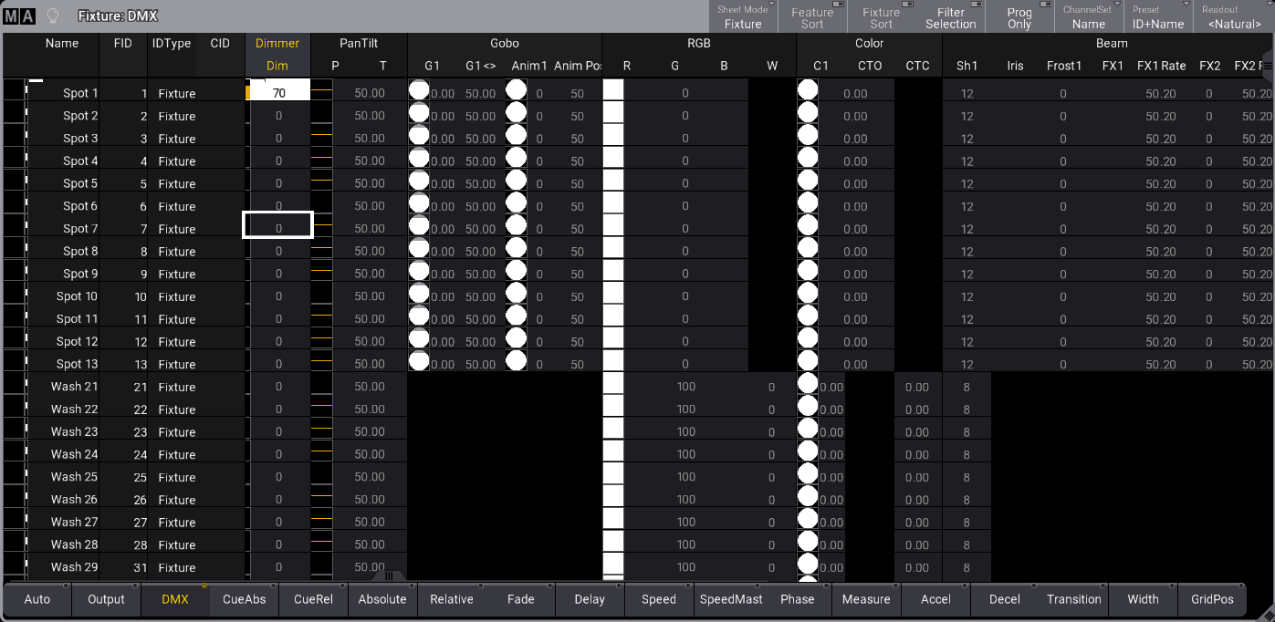 The fixture name cells are displayed with a white marker in the fixture sheet for fixtures/attributes with active values from the DMX tester. For more information, see DMX Sheet.