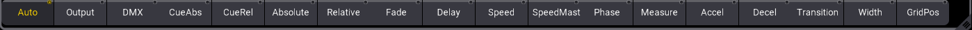 The CueAbs layer displays each attribute's sequence, cue, and part numbers with an absolute value originating from a running playback. The displayed information refers to the playback that defines the current output value for the attribute. For more information, see CueAbsolute keyword. Typical values, such as a selected static position, are displayed in the absolute value layer.