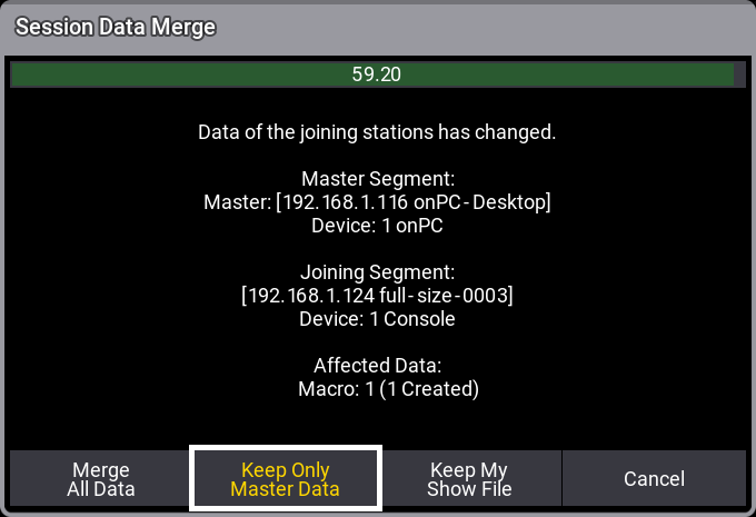 This option will use the show file running on this joining station. If Merge All Data If Compatible is inactive, the joining station will transfer its show file to the session members. This deletes any unsaved data on the other stations.