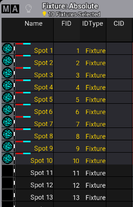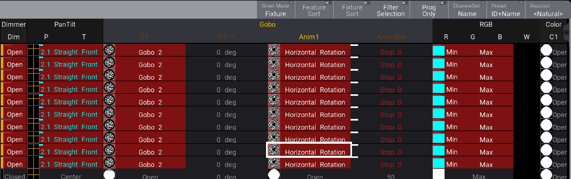 The attributes of the features Dimmer, PanTilt, Gobo, RGB, and Color1 can have a small symbol displaying a graphic representation of the attribute values: