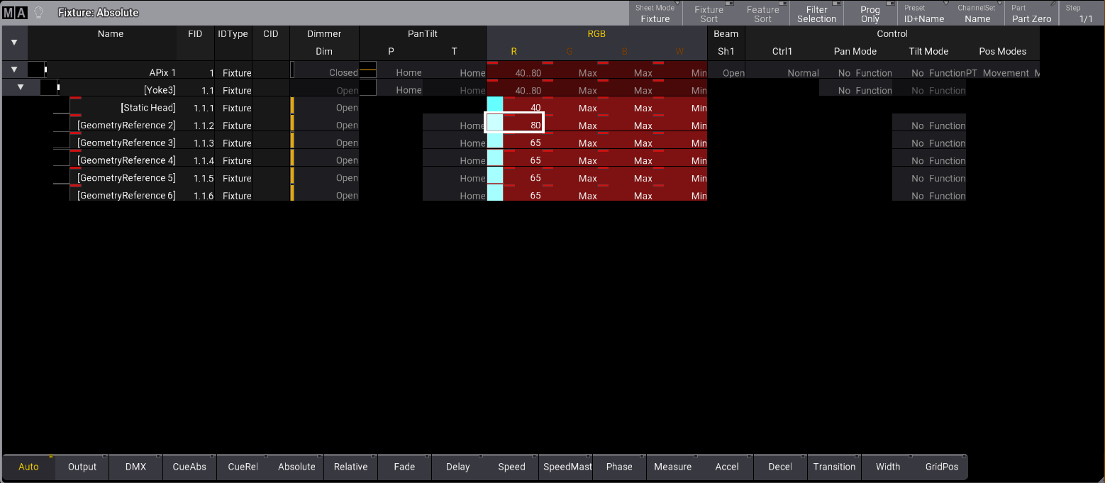 In the image below, the red attribute value was set to 40 for sub-fixture 1.1.1, 80 for fixture 1.1.2, and 65 for sub-fixtures 1.1.3 through 1.1.6.