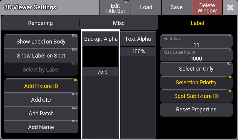 This on-screen fader sets the transparency of the text displayed on the label. -