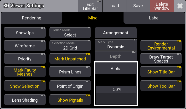 This opens a settings pop-up. This pop-up has tabs called Rendering, Misc, and Label.