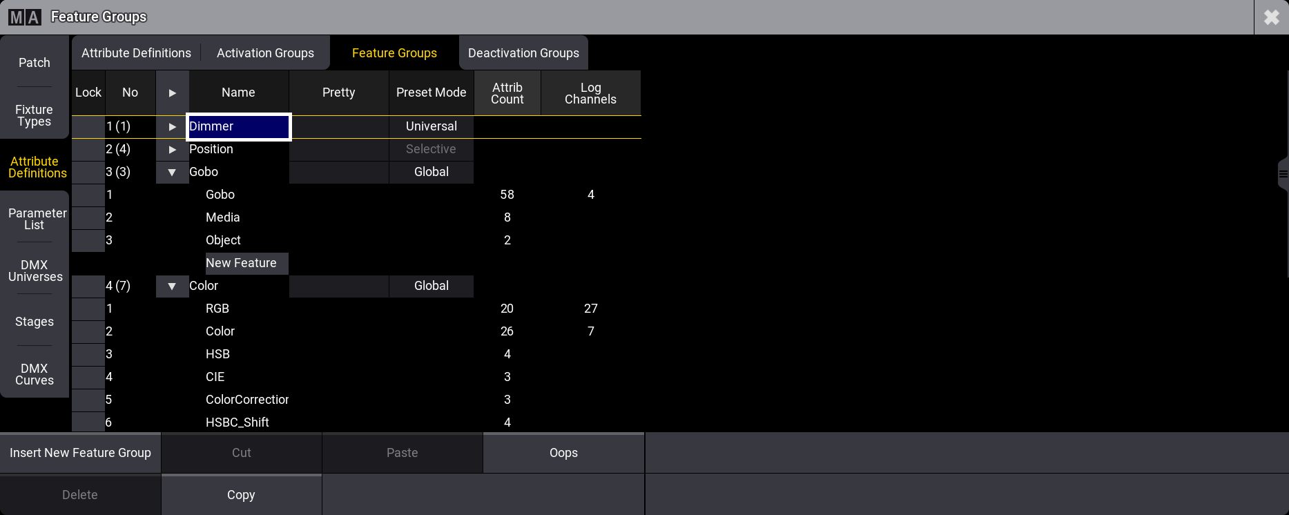 grandMA3 User Manual » Patch and Fixture Setup » Attribute Definitions » Feature Group
