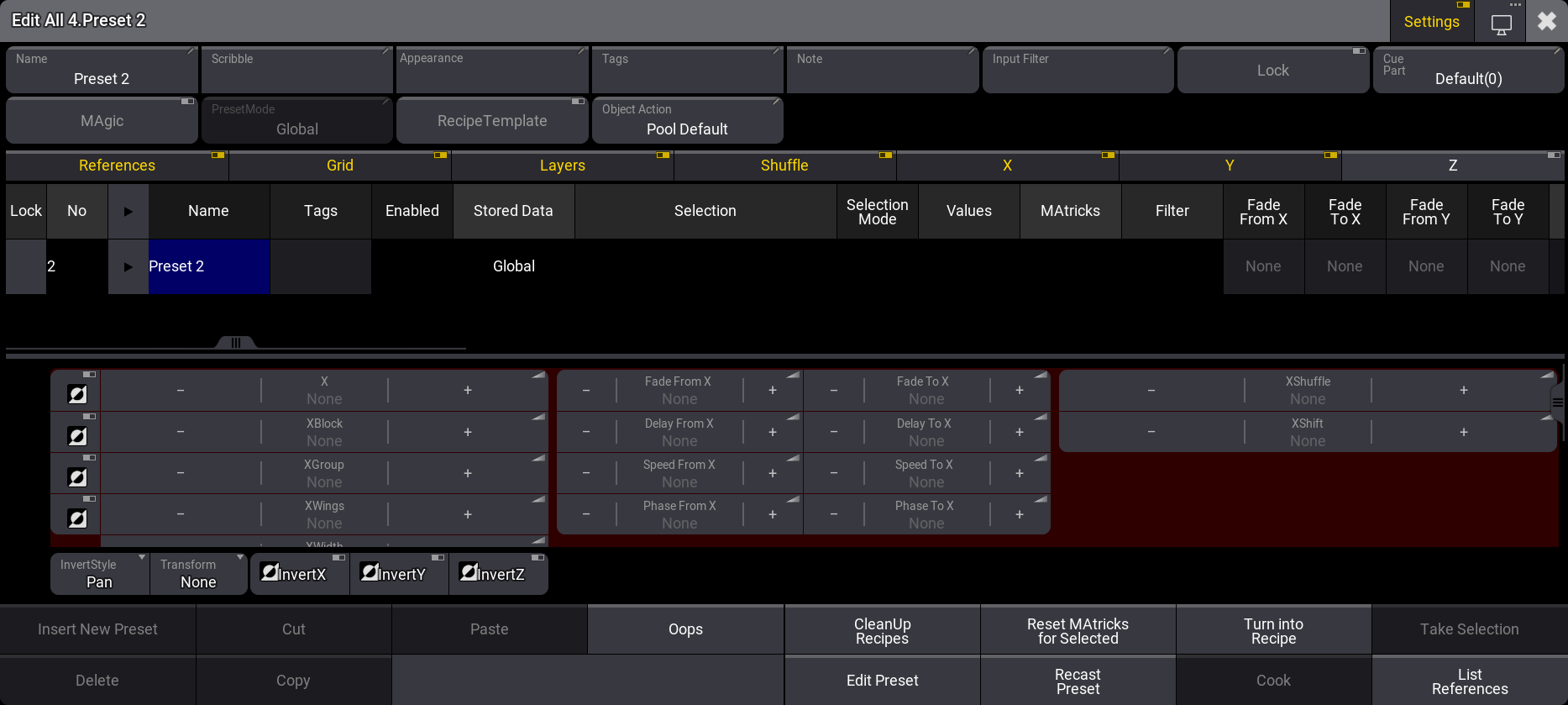 This allows using a selection of fixtures instead of a group. Tap this button to make the current programmer fixture selection the new selection for the selected recipe line. - Edit Preset: