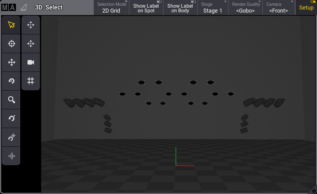 When the fixtures are patched, they are positioned at the zero position. This is where we see a green and red line in the image above. It is on the floor in the middle of the stage area as a default.