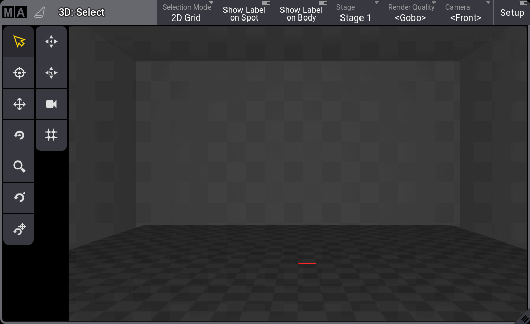 We are looking at the stage area through a virtual camera. There are several default cameras, but for now, we are just gonna use the one called Front. You can see the camera we use in the 'Camera' button in the title bar.
