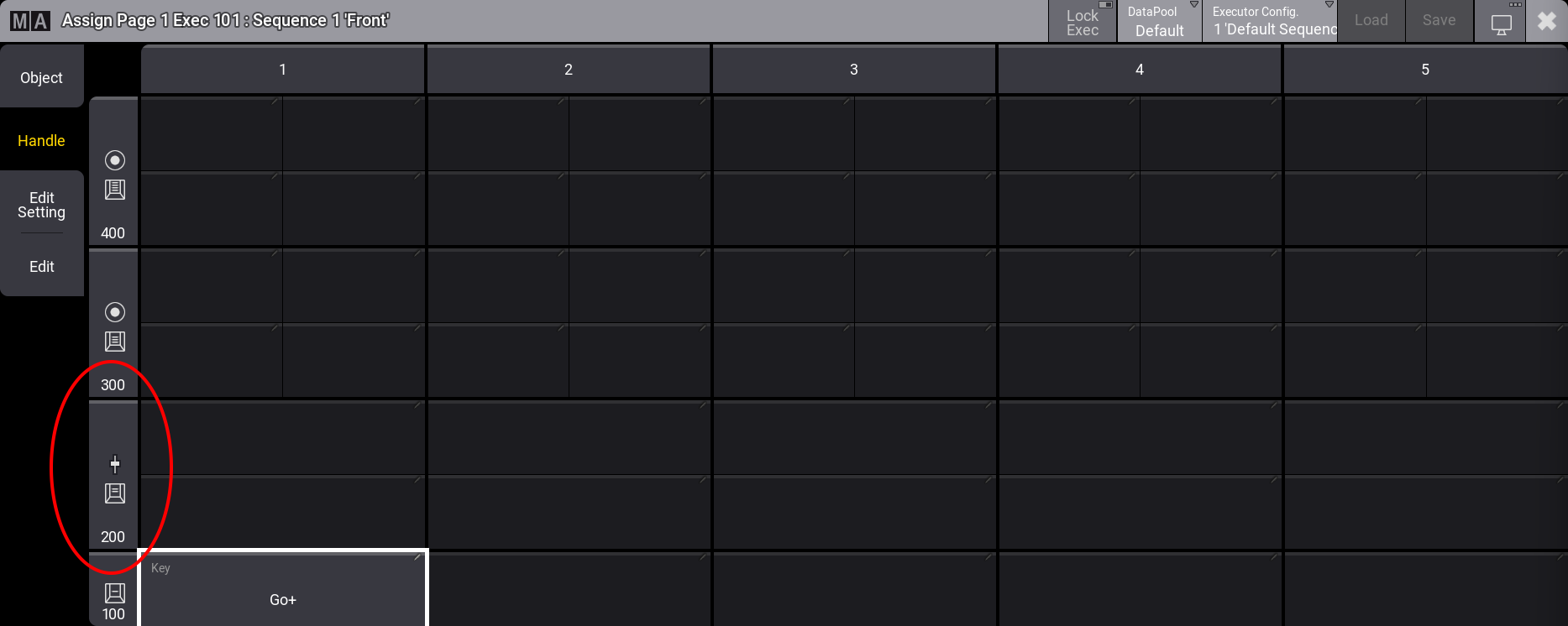 Press Assign and then executor 202. In the Assign Menu, we see that the 100 button is grayed out. This means that we cannot expand the executor down.
