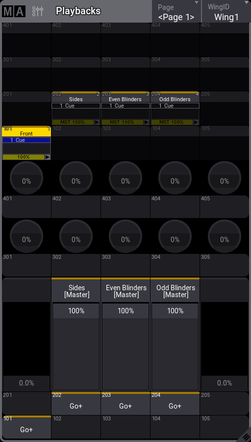 Clear the programmer, repeat the steps above for group 4 (Even Blinders), and store them to executor 203. And finally, store group 5 at 100% on executor 204.