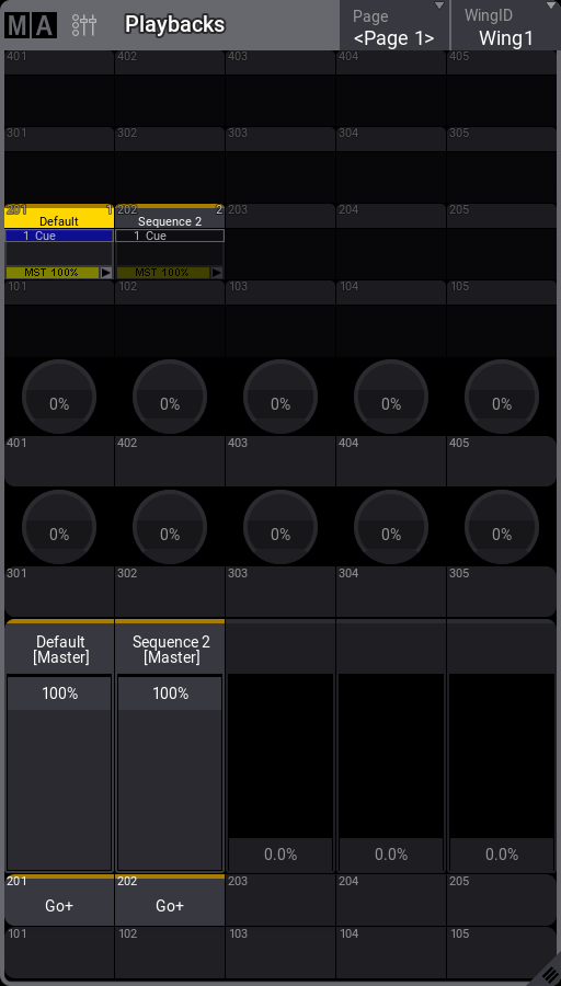 With sequence 1 already assigned to executor 201, we can move the left executor fader, and it also controls the master intensity for the sequence. Notice that the master in the Master Area also moves. Both faders do the same thing for Sequence 1.