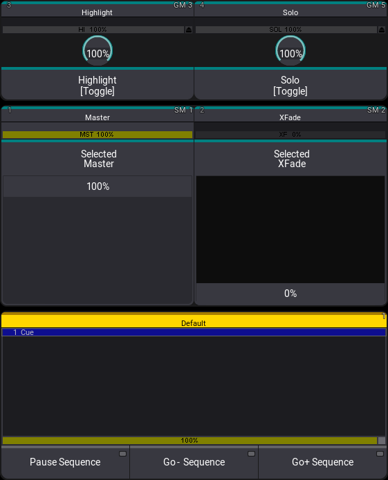 On the grandMA3 hardware, the master area is the two long faders and the three dedicated buttons for 'Go+', 'Go-' and 'Pause'. Some hardware also has some extra buttons and knobs above the faders.
