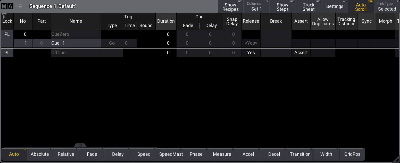 A sequence always contains two default cues: CueZero and OffCue. The OffCue controls different timings when the sequence is turned Off.