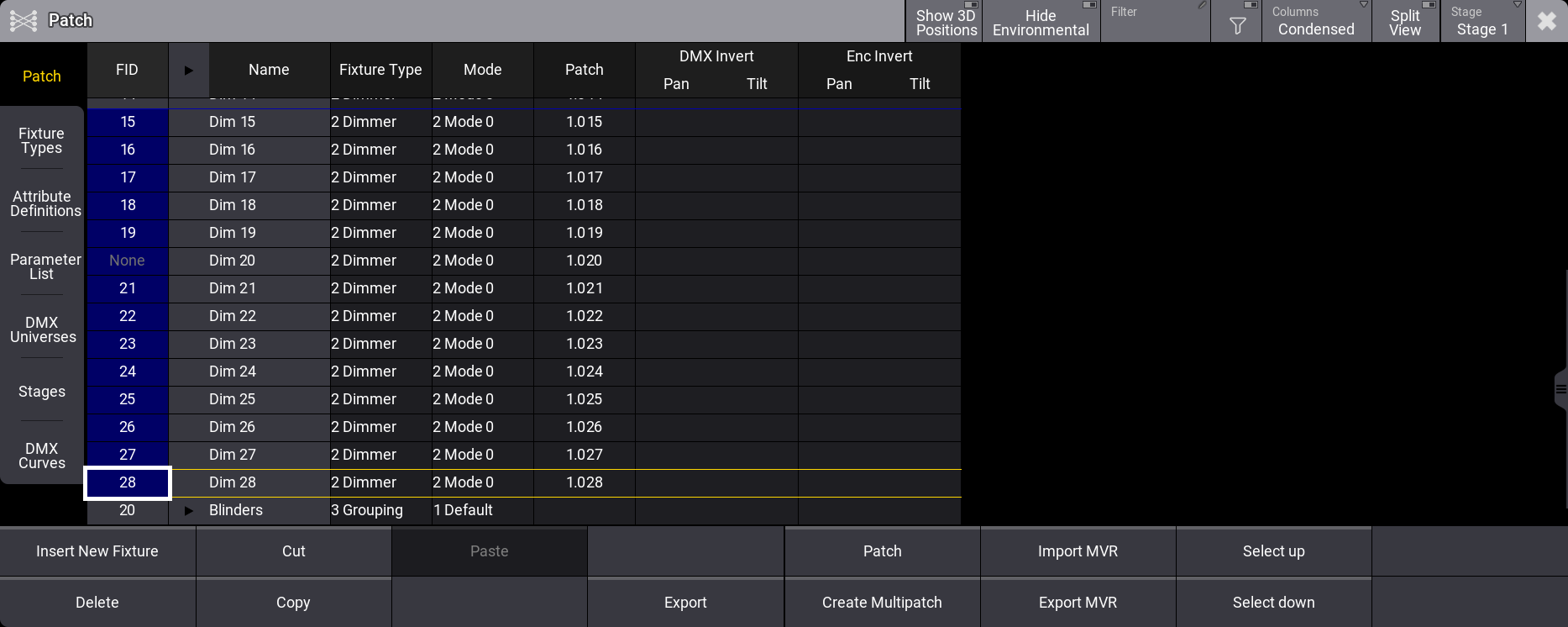 Now we have 28 dimmers named "Dim" followed by a number. They are patched to DMX address 1 in DMX universe 1 and upwards.