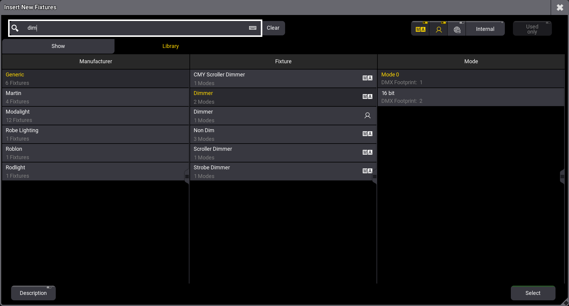Now, the list is limited to only showing fixtures that have dim somewhere in the manufacturer name, the fixture name, or the fixture mode.
