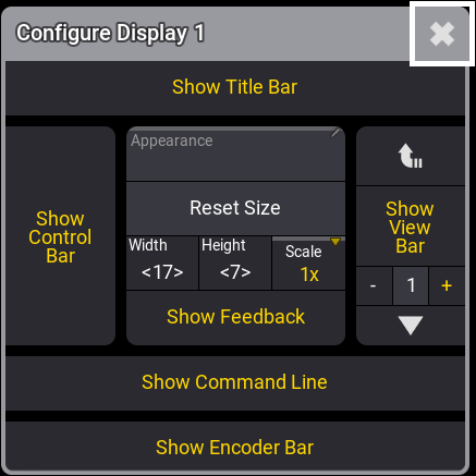 It can also be configured to hide some areas or scale the interface. This is done using the Configure Display pop-up. This can be accessed when the Menu selection pop-up is visible. Do this by clicking the gear icon () in the control bar. Then click Configure Display in the smaller "Display" pop-up.