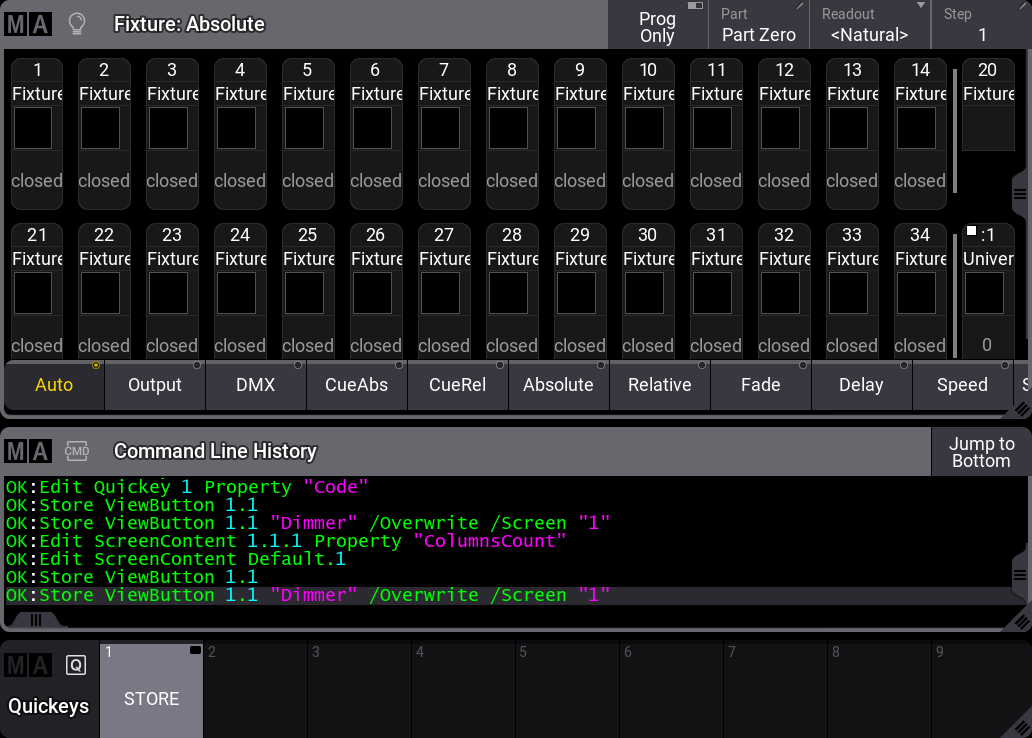 Click the command line input where it says "Admin[Fixture]>". Now write Store, so the command line looks like this:
