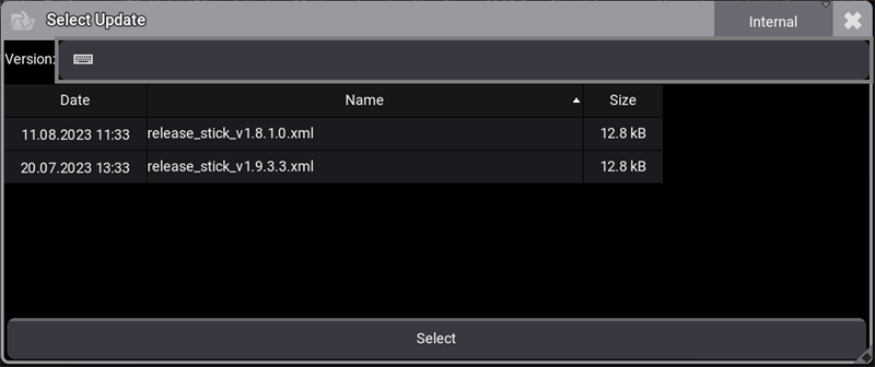 - Make sure the correct update file location is selected (Interal or external device). Select the desired update file.