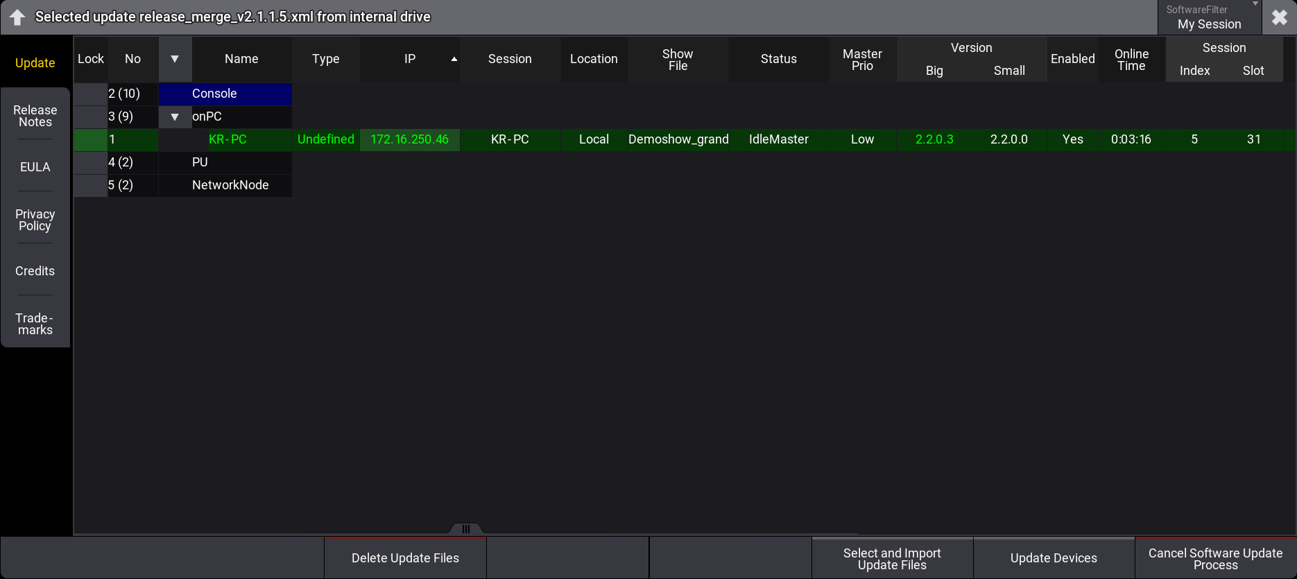 It is also possible to update the grandMA3 onPC, consoles, xPort Nodes, onPC command wing XT, processing unit and onPC rack-unit directly. |
