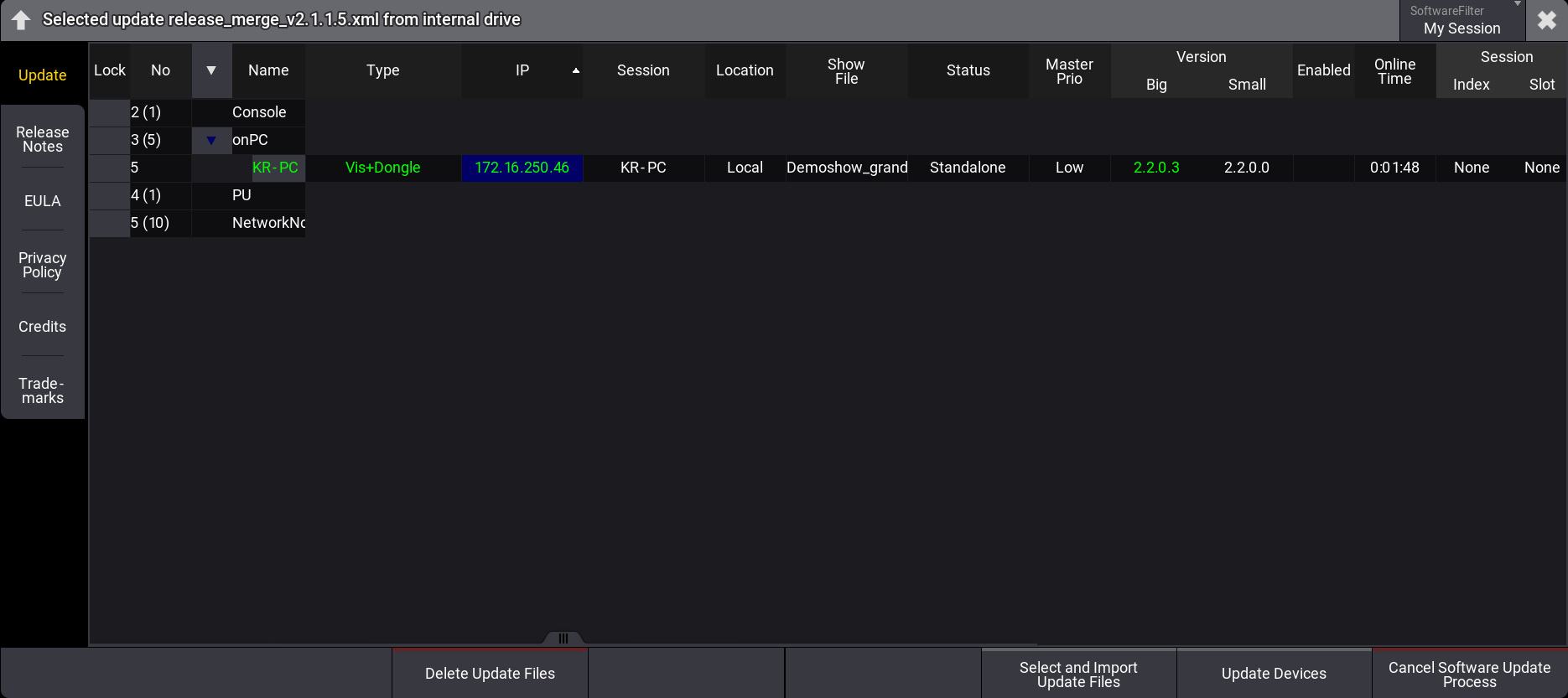 The selected update file is displayed at the title bar of the software update window. - Select the third-party visualizer with viz-key support. The selected devices turns into bright blue.