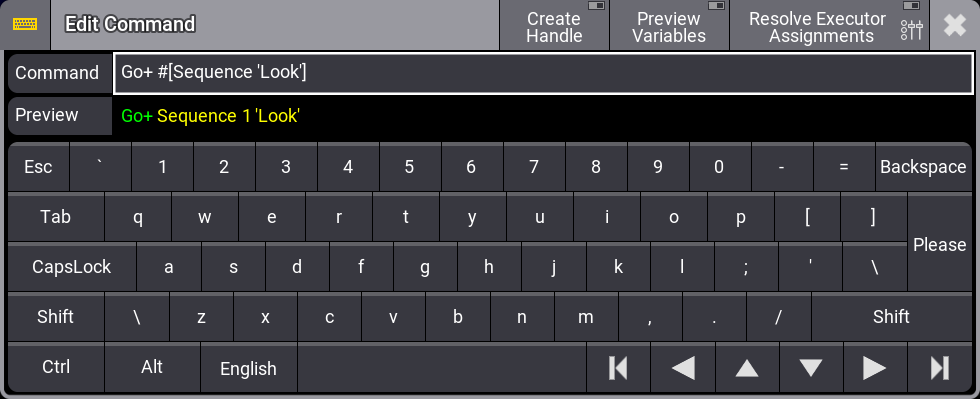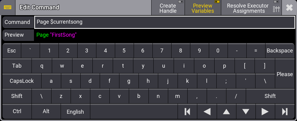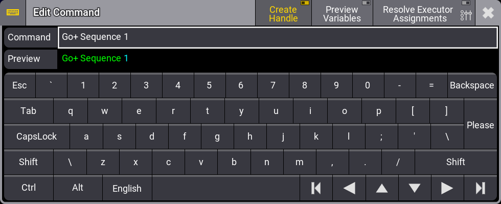 Sequence 1 'FirstSong' is assigned to executor 1.201 in the following example. Pressing that executor when inputting a command when Resolve Executor Assignments is enabled, the handle of the object assigned to the pressed executor is entered in the command. The preview displays the object type, number, and name in yellow.