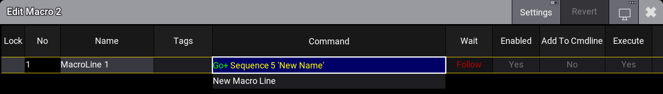 The preview and macro editor display the current location and name of the object. - Move the sequence to slot 5 in the sequence pool.