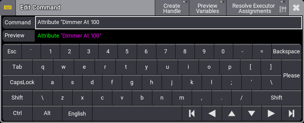 The entered command is previewed to see if the software will interpret it as intended: Attribute "Dimmer" at 100.