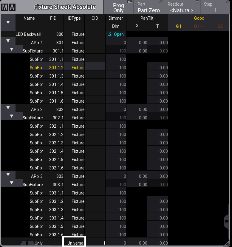 In this example all fixtures on the top level have to be selected: Fixture 301 Thru 303.1..