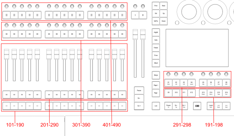 The executor 401 thru 490 are located as the upper buttons and knobs in the executor section. One button and one knob is one executor. On the hardware keys, these have labeled four horizontal line on top of them. In the Playback Control overlay or the Playback window, they are named by their number.