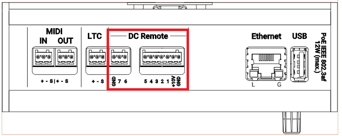 - To use the DC Remote, feed a voltage signal (maximum +10V DC) into the corresponding input pin. For more information see the pinout image below.