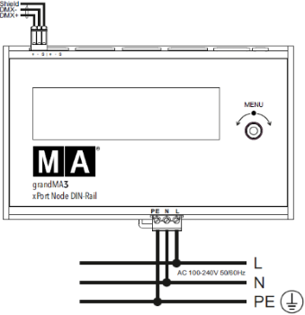 Wichtig: Installieren Sie den grandMA3 xPort Node DIN-Rail horizontal, sodass die Eingangsbuchse sich unten und der DMX-Anschluss oben befindet. |