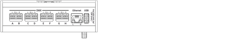 | Important: Utilisez le port USB uniquement pour les mises à jour. Ne connectez aucun périphérique (par exemple, souris, clavier). Chaque sortie DMX512-A à 3 broches peut être configurée individuellement comme entrée DMX. |