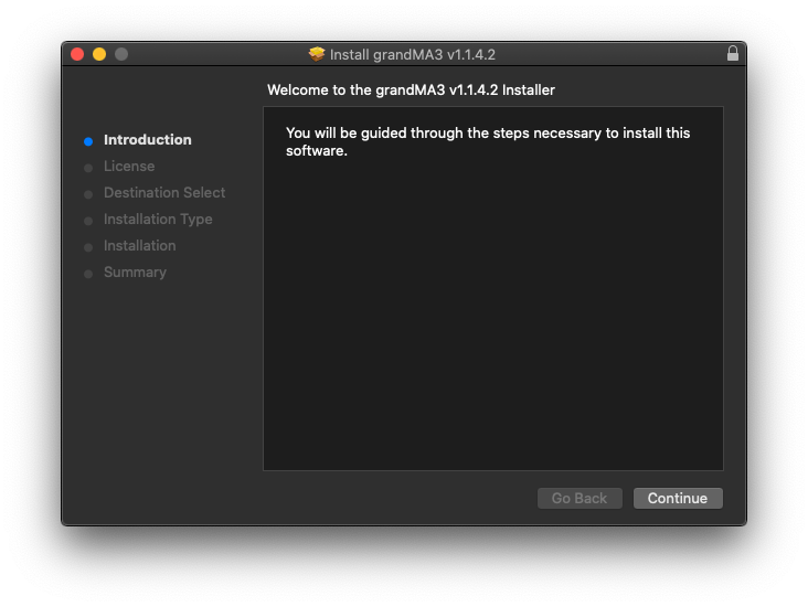 - Double-click the installation program grandMA3_onPC_x.x.x.x.pkg. The Installer opens: