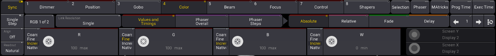 When multiple fixture types are selected, the smallest physical range of a fixture is taken to determine the size of one click. This allows the same value to change when, for example, turning the tilt encoder. - Dec8: 255/(24*5), therefore 1 click equals 2.125