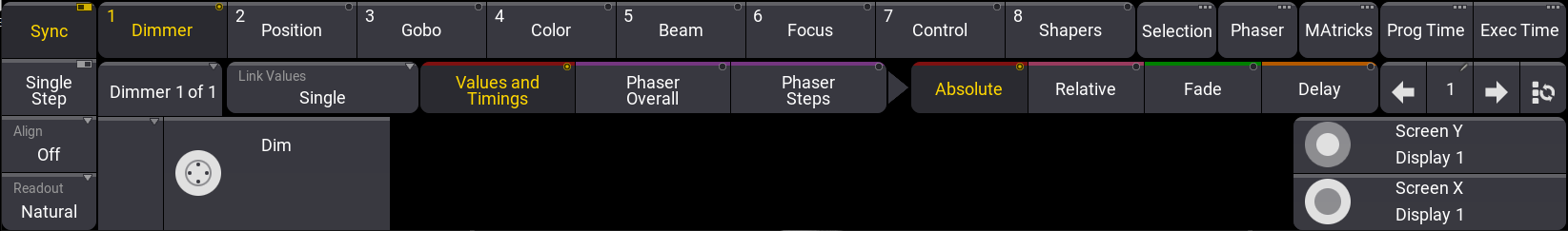 - Select Dimmer in the encoder bar and use the dual encoders to set a value.