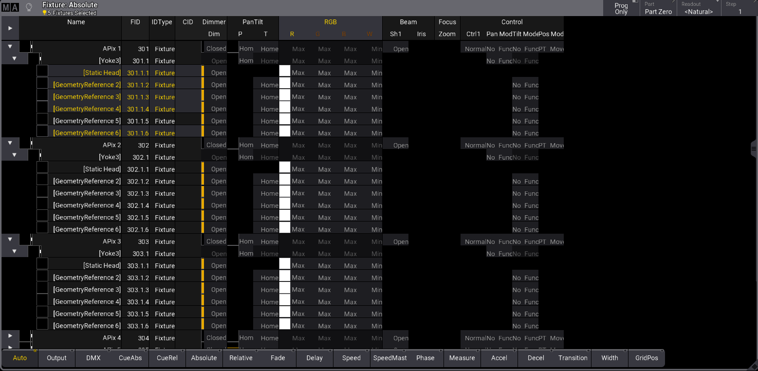 - A dot (.) can be added to the main fixture's selection syntax to select all sub-fixtures quickly.