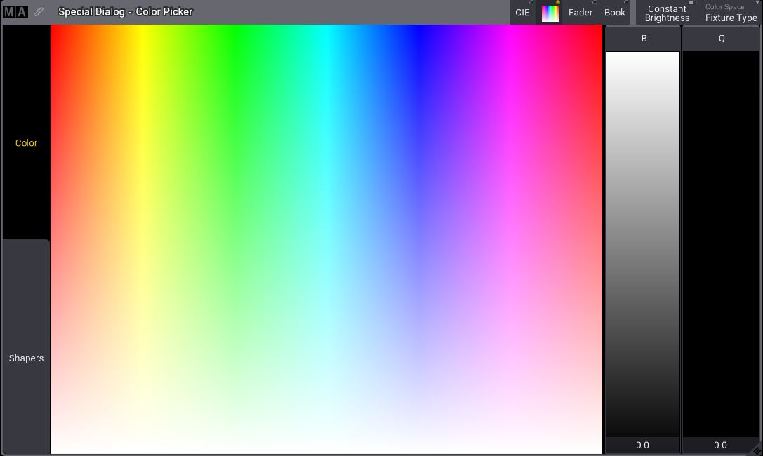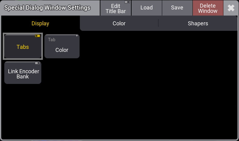 The Color tab and the Shapers tab on the left side of the Special Dialog window can be used to switch between the different functions. In the Special Window settings, these tabs can be shown or hidden by toggling Tabs. For more information about window settings in general, see Window settings.
