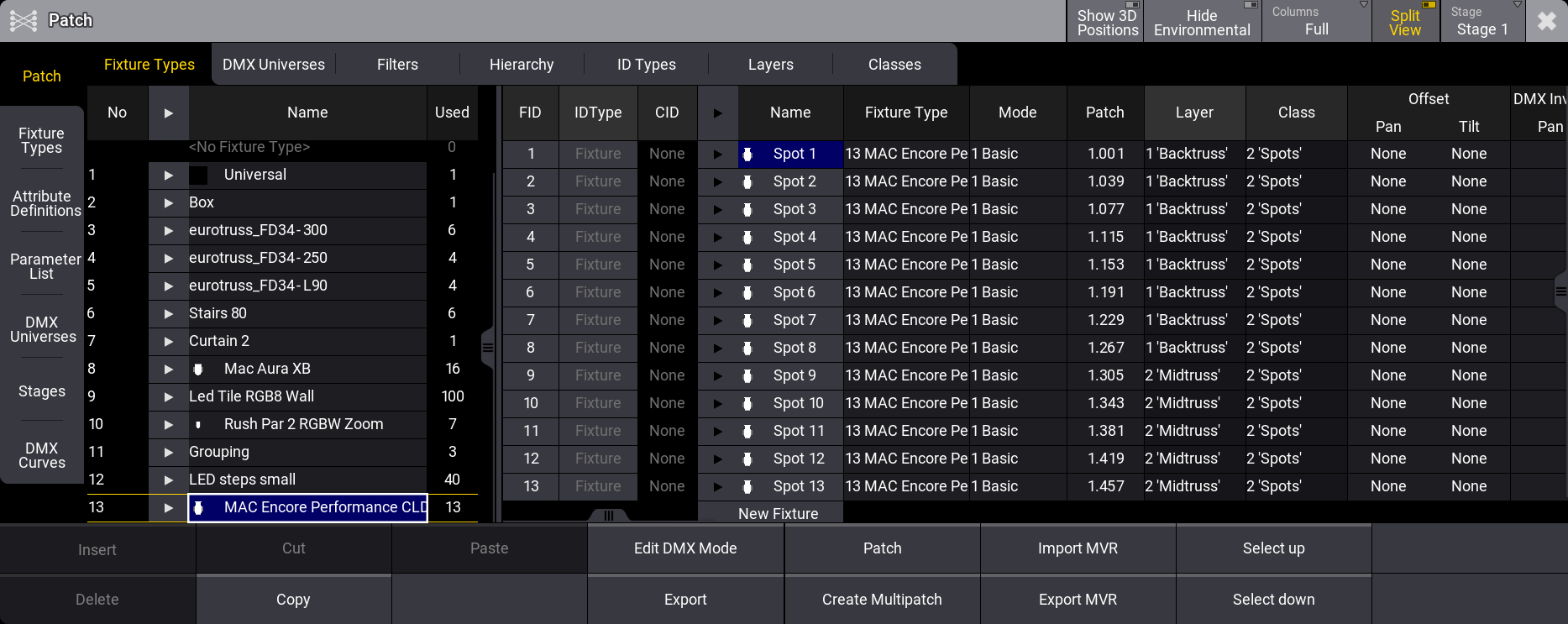 The fixture list can also be filtered using the filter settings in the title bar or by activating Split View.