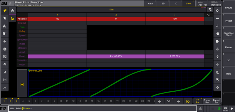 A phaser has two steps with an absolute dimmer value of 100% in step 1 and an absolute dimmer value of 0% in step 2. With all other phaser layers at their default values, the resulting output is a smooth, repeating fade of the dimmer output from 100% to 0% and back to 100%.