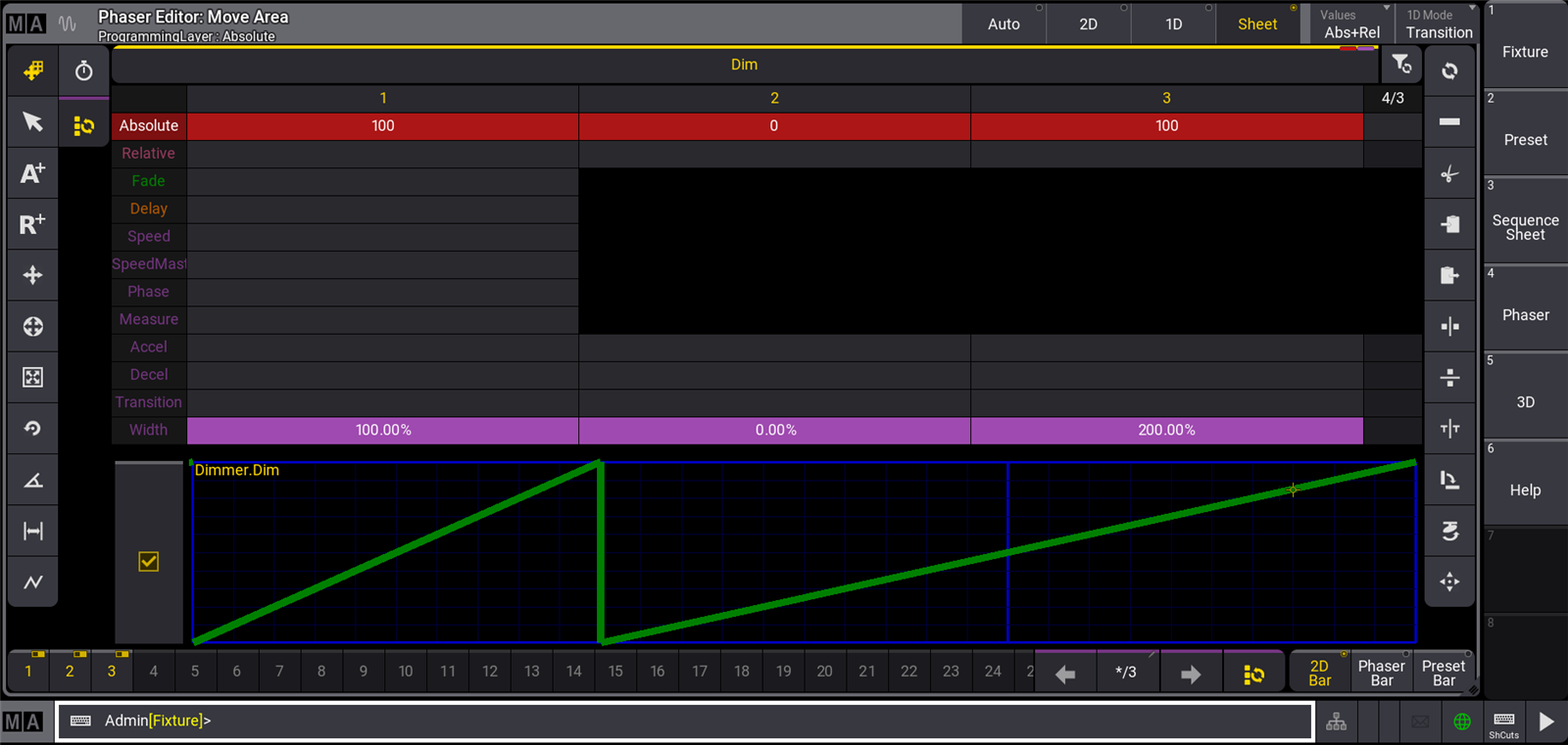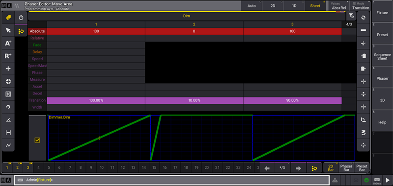 Each phaser step can include attribute value information. These values can be an absolute value (for instance, a dimmer value of 50%) or a relative value (for instance, a dimmer value of -20%). Steps can contain both absolute and relative values simultaneously.