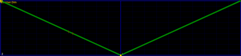 This is the base for the phaser. There are now two steps with a dimmer value of 0 in the first step and a value of 100 in the second step. All the fixtures are changing together from step one to two in a linear direction and do not fade using a sine curve. It looks like this in the Phaser Editor: